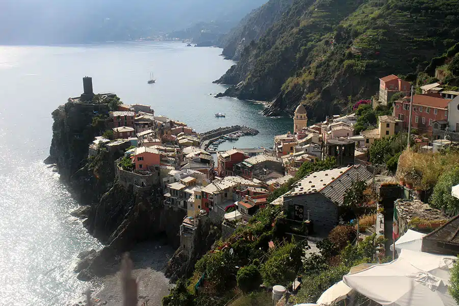 Det er svært helt at tro sine egne øjne, når Vernazza dukker op som en komplet Hodja fra Pjort-by set oppe fra stien på bjergsiden: